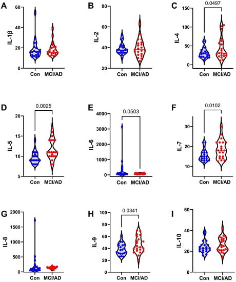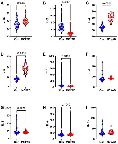 MCI/AD effects on serum cytokine and chemokine expression—1: Bead-based multiplex ELISAs were used to measure cytokines, chemokines, or trophic factors in serum. Violin plots depict inter-group comparisons with individual values corresponding to the control (Con; N = 21) and MCI/AD (N = 18) levels of (A) IL-1β, (B) IL-2, (C) IL-4, (D) IL-5, (E) IL-6, (F) IL-7, (G) IL-8, (H) IL-9, and (I) IL10 analyzed using Student’s t-test. Significant (p < 0.05) and statistical trend (0.05 < p < 0.10; italicized) inter-group differences are shown within each panel.