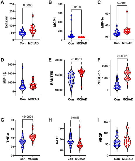MCI/AD effects on serum cytokine and chemokine expression—3: Bead-based multiplex ELISAs were used to measure cytokines, chemokines, or trophic factors in serum. Violin plots depict inter-group comparisons with individual values corresponding to the control (Con; N = 21) and MCI/AD (N = 18) levels of (A) eotaxin, (B) MCP-1, (C) MIP-1α, (D) MIP-1β, (E) RANTES, (F) PDGF-bb, (G) TNF-α, (H) b-FGF, and (I) VEGF analyzed using Student’s t-test. Significant (p < 0.05) and statistical trend (0.05 < p < 0.10; italicized) inter-group differences are shown within each panel.