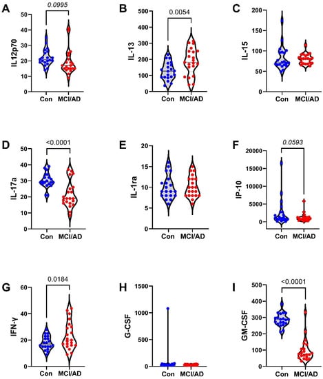 MCI/AD effects on serum cytokine and chemokine expression—2: Bead-based multiplex ELISAs were used to measure cytokines, chemokines, or trophic factors in serum. Violin plots depict inter-group comparisons with individual values corresponding to the control (Con; N = 21) and MCI/AD (N = 18) levels of (A) IL-12p70, (B) IL-13, (C) IL-15, (D) IL-17a, (E) IL-1ra, (F) IP-10, (G) IFN-γ, (H) G-CSF, and (I) GM-CSF analyzed using Student’s t-test. Significant (p < 0.05) and statistical trend (0.05 < p < 0.10; italicized) inter-group differences are shown within each panel.