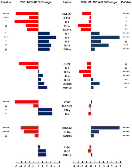 Databar plots depicting the effects of MCI/AD on CSF and serum cytokine expression profiles: Multiplex magnetic-bead-based ELISAs measured 27 human cytokines and chemokines. Databar plots compare the mean percentage changes in immunoreactivity for MCI/AD versus control CSF (left) and serum (right). Reductions in immunoreactivity are indicated by bars to the left of the median, while increases are shown by bars to the right. The scales at the bottom reflect 20% incremental reductions (negative values) or increases (plus values to the right of 0) in cytokine expression in MCI/AD versus control groups. Statistical comparisons were conducted by unpaired t-tests: * p < 0.05; ** p < 0.01; *** p < 0.005; **** p < 0.001; ***** p < 0.0001; ψ 0.05 ≤ p ≤ 0.10 (statistical trend).