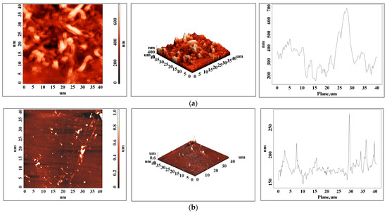 Atomic force microscopy images of the surface of a (a) cast and (b) 3D-printed sea mesh element for an area of 40 × 40 μm2.