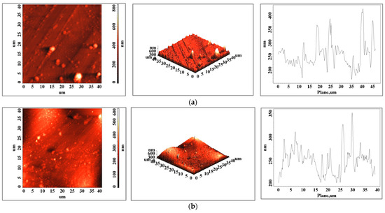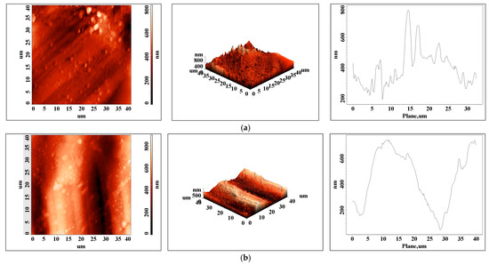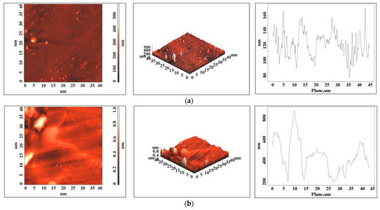 In the case of the analysis of metal elements for dental applications, an NTEGRA scanning probe microscope (NT-MDT Spectrum Instruments, Moscow, Russia) in AFM configuration was used. The surface images were obtained using a Solver PRO-M scanning probe microscope (NT-MDT, Spectrum Instruments, Moscow, Russia), in AFM configuration. Rectangular silicon cantilevers NSG10 (NT-MDT, Spectrum Instruments, Moscow, Russia) with tips with a high aspect ratio (sharpened pyramidal tip, angle of nearly 20°, tip curvature radius of 10 nm, and height of 14–16 µm) were used in order to minimize convolution effects. All images were acquired in air, at room temperature (23 °C), in tapping mode, with a velocity of 6 mm/s. For image acquisition, Nova v.19891 Solver software was used [25].