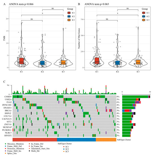 Relationship between TMB and molecular subtypes. (A) Distribution of TMB for subtype samples. (B) Distribution of the number of mutations for subtype samples. (C) Mutation features of significantly mutated genes in samples of each subtype. * p < 0.05. ns: no significance.