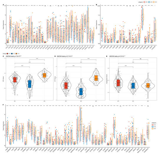 Examination of the RNA-seq cohort revealed differential chemokine expression for 28 of 33 chemokines (84.85%; Figure 2A), suggesting differences in immune cell infiltration and immunotherapeutic responses in the three ICs. Immunophenotyping also identified differential expression for 14 of 18 chemokine receptor genes (Figure 2B).