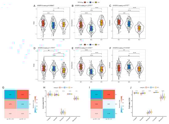 The clinical effects of immunotherapy on the three ICs were assessed using TIDE (http://tide.dfci.harvard.edu/ (accessed on 20 August 2021)), with a higher TIDE prediction score indicating a greater likelihood of immune escape and lower immunotherapy efficacy. Analysis of the RNA-seq dataset indicated that IC2 and IC3 could benefit more from immunotherapy than IC1 (Figure 4A). Comparison of projected T cell dysfunction and rejection ratings revealed that IC2 exhibits reduced T cell dysfunction, and the projected T cell rejection scores were greater for IC1 and IC2 than for IC3 (Figure 4B,C). Consistent trends were observed for the GSE dataset (Figure 4D–F).