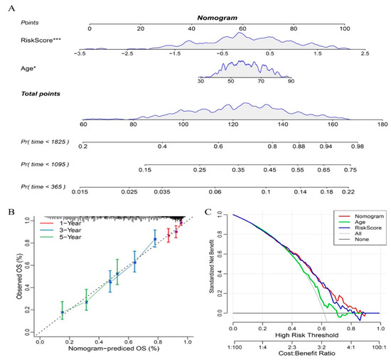 Nomogram and forest plot constructed with the RiskScore and clinical features using the TCGA dataset. (A) Nomogram. (B) Calibration curves showing the observed OS versus predicted probability of 1-, 3-, and 5-year survival of the nomogram. (C) Decision curve analysis plot. * p < 0.05, *** p < 0.001.