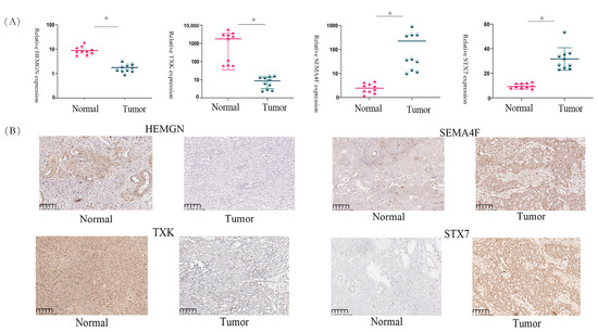 (A) qPCR and (B) IHC results showing low HEMGN and TXK and high SEMA4F and STX7 expression in OC tissues. * p < 0.05.