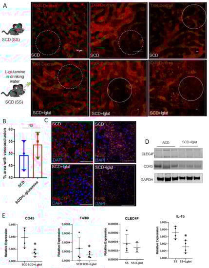 Figure 1. L-glutamine treatment does not ameliorate ischemic injury in SCD mouse liver. (A) Quantitative liver intravital (qLIM) imaging of three different fields of view of SCD mice at baseline and post-L-glutamine administration injected with TXR-dextran. Dotted circle shows loss of blood flow in SCD liver which was comparable in L-glutamine-treated SCD mouse liver. (B) Quantification of the total area (%) of liver with loss of blood flow in SCD mice at baseline and post-L-glutamine treatment. (C) Representative IF images show enhanced CLEC4F and F4/80 expression in SCD liver which was not seen after L-glutamine administration. (D) Western Blot for CLEC4F and CD45 antibodies exhibits increased expression in the liver of SCD mice compared to L-glutamine-treated SCD mouse liver. (E) qRT-PCR analysis exhibits reduced mRNA expression of markers of inflammatory cells (including F4/80, Cd45, CLEC4F, and IL1β) in L-glutamine-treated SCD liver compared to SCD liver at baseline. * denotes p < 0.05, NS, Not significant.