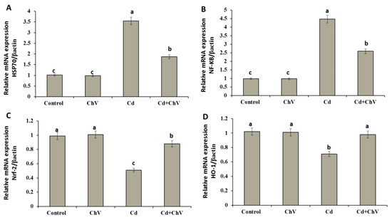 Figure 2. Relative expression of HSP70 (A), NF-kB (B), Nrf-2 (C), or HO-1 (D) mRNA in hepatic tissue of rats exposed to Cd and C. vulgaris separately or in combination. Data were analyzed using One-way ANOVA followed by Duncan’s Multiple Range test to compare mean value between groups (control, ChV: chlorella vulgaris-treated group, Cd: cadmium-treated group, Cd + ChV: cadmium + C. vulgaris treated group). Data were expressed as mean ± SE. Values not sharing a common superscript letter (a, b, c where a: the highest value, c: the lowest value) differ significantly at p < 0.05.
