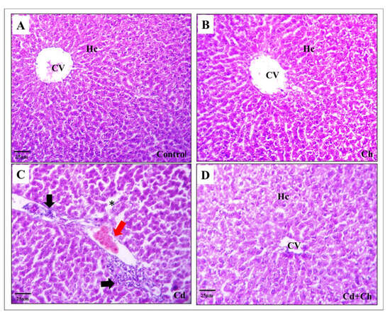 Figure 3. Cadmium alters hepatic tissue architecture: (A) Photomicrograph of a hepatic tissue section of the control group stained with H&E showing normal histology with a lobular area of central vein (CV) and hepatocytes (Hc). (B) C. vulgaris-fed group showing no mild difference from the control group. (C) Cadmium treated group showing congestion of the central vein and portal area with inflammatory cellular infiltration (black arrow) and blood congestion (red arrow). Notice the dilated sinusoidal spaces with hepatocyte damage (black asterisk). (D) Treated group of cadmium and C. vulgaris showing the relief effect of chlorella against the toxic effect of cadmium on the central vein and hepatic cords.