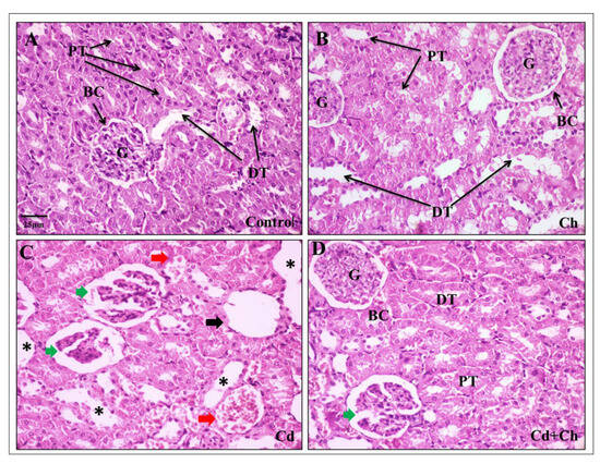 Figure 4. Effects of cadmium and chlorella on the kidney: (A) Photomicrograph of control kidney showing normal histology of Bowman capsule (BC), glomerulus (G), proximal convoluted tubule (PT), and distal convoluted tubule (DT). (B) Photomicrograph of chlorella-fed group showing normal renal corpuscles. (C) Cadmium treated group showing severe degenerative alternations in the renal tubules (black asterisk), corpuscle degeneration (black arrow), glomeruli segmentation with Bowman space widening (green arrow), and blood congestion (red arrow). (D) Cd + C. vulgaris co-administrated group showing the protective change of C. vulgaris on the glomeruli and tubules epithelial cells except for mild corpuscle segmentation (green arrow).