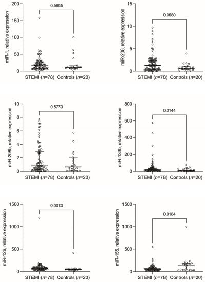 - Scărlătescu, A.I.; Micheu, M.M.; Popa-Fotea, N.M.; Dorobanțu, M. MicroRNAs in Acute ST Elevation Myocardial Infarction-A New Tool for Diagnosis and Prognosis: Therapeutic Implications. Int. J. Mol. Sci. 2021, 22, 4799. [Google Scholar] [CrossRef]