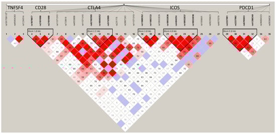 In Figure 1, the color of the box indicates the degree of linkage disequilibrium (LD) between the two SNPs. The color gradually changes from white to red, indicating that LD is becoming stronger, and purple indicates that there is no LD. In LD analysis, it was found that CD28 (rs1879877/rs3181097/rs3181098), CTLA4 (rs62182595/rs16840252/rs5742909), and PDCD1 (rs2227981/rs2227982/rs6705653/rs41386349) each had one haplotype block, and ICOS had two haplotype blocks (rs11889352/rs11883722 and rs10932036/rs4404254/rs10932037/rs10932038). In haplotype analysis (Table 4), it was found that the five CTLA4 haplotypes (Ars62182595Trs16840252Crs5742909, Ars62182595Trs16840252Trs5742909, Ars62182595Crs16840252Crs5742909, Ars62182595Crs16840252Trs5742909, and Grs62182595Trs16840252Crs5742909) and one ICOS haplotype (Ars11889352Crs11883722) were associated with GO (all p = 0.034).