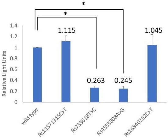Comparing the transcriptional activity levels of the reporter contractions with rs11571315 C > T, rs733618 T > C, rs4553808 A > G, rs16840252 C > T and wild type. “*” indicates statistical significance (p < 0.05).