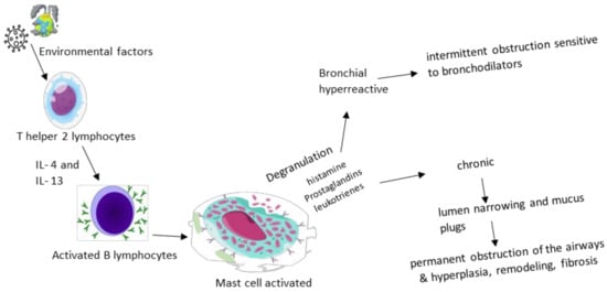 Thus, Barrios RJ. et al., bring to the fore, through a centralization of studies from the last decades, two physiopathological mechanisms based on Th2 action, subdividing the obstructive process according to not only the type of hypersensitivity response (1 versus 4) and the interaction with the targeted receptors (immunoglobulin receptors, leukotrienes or the α chain of the IL-4 receptor), but also the involved interleukins (IL-4, IL-5, IL-9, IL-13). The role played by IL-4 is also emphasized in the production of immunoglobulin E (IgE) antibodies, the target of which is the immune cells that they sensitize for a subsequent encounter with the pathogen, at which point degranulation and the release of inflammatory molecules occur with both direct involvement (amplification of hypersensitivity, glycoprotein production and eosinophilia, similar to leukotrienes) and indirect involvement by stimulating mast cell maturation and IgE secretion [19,20]. Mast cell degranulation occurs as a result of the cross-link formed between two IgE molecules and the causative antigen, which, together with eosinophils activated by means of IL-5, maintain the inflammatory process by means of cytokines [21]. At the opposite pole of the immune mechanism are regulatory T lymphocytes (Treg) that influence the expressions of CD 25, the transcription factor forkhead box P3, transforming growth factor beta (TGF-β) and interleukin 10 (IL-10), components that play a role in modulating the immune tolerance. Beyond these, the regulatory B cell population is also being studied for activity in human subjects with asthma [22]. An essential role in the physiopathogenesis of asthma is also played by the endothelial growth factor, involved in inducing the proliferation of the respiratory vasculature, which has the effect of narrowing the lumen [20].