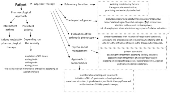 It is vital to establish the patient’s ability to take part in daily activities, as it has been proven that, in most cases, it is necessary to administer a preventive SABA or physical exercises to reduce the bronchoconstriction induced by them. Inhaled corticosteroids in a single dose in subjects who do not benefit from them as a background treatment also offer a protective effect, an aspect not found in the case of those treated regularly with ICSs, in which there is a reduction in the frequency and severity of bronchoconstriction without, however, eliminating the need for acute therapy [115]. Regarding the impact on mortality, studies demonstrate that severe uncontrolled asthma increased the risk of mortality only for patients without a history of psychiatric disease, but there was no significant difference between patients with severe uncontrolled asthma and the general population in patients with a history of psychiatric disease [116]. Summarizing the data stated above, Figure 2 shows the optimal way of therapeutic management of the asthmatic patient. This must be centered on both the pharmacological component and the complementary one, adjuvant therapy.