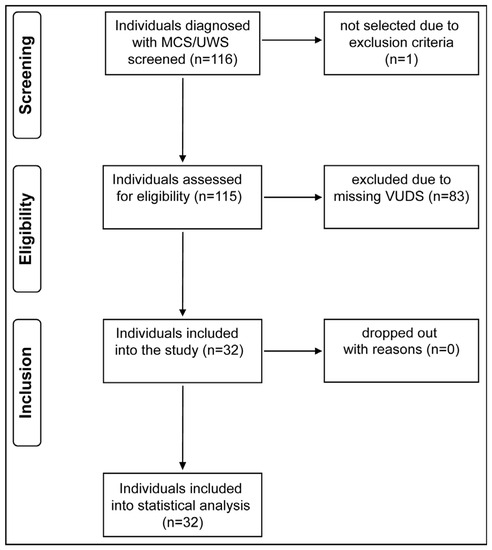Study flow diagram. From a pool of 116 screened individuals, 32 fulfilled all inclusion criteria and were included in our analysis. MCS/UWS = minimally conscious state/unresponsive wakefulness syndrome, VUDS = video-urodynamic studies.