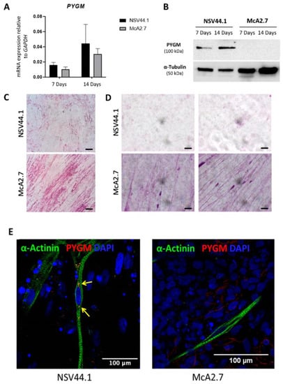 Firstly, we analysed and quantified the PYGM gene expression by RT-qPCR analysis using Taqman probes, both at 7 and 14 days after the final differentiation. As expected, we detected a higher expression of PYGM at 14 days of final differentiation than at 7 days in the two differentiated iPSC lines (NSV44.1 and McA2.7) (Figure 4A). Furthermore, there were no statistically significant differences between the expression of PYGM in the skeletal muscle obtained from NSV44.1 and McA2.7, although there is a possible tendency to be slightly more expressed in NSV44.1 versus McA2.7.