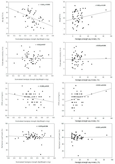 Figure 1 shows negative correlations (Pearson) between HGS/kg and Aix@75 (r = −0.440, p = 0.0008) and PVR (r = −0.260, p = 0.050), and a positive correlation between HGS asymmetry and PVR (r = 0.322, p = 0.016). The linear regression analysis, adjusted for sex and age, and the model of covariance with three levels of interaction were not significant. The two-level interaction effect regression model showed an inverse association between HGS/kg and Aix@75 as age increased in the population (p < 0.05) (Table 2).