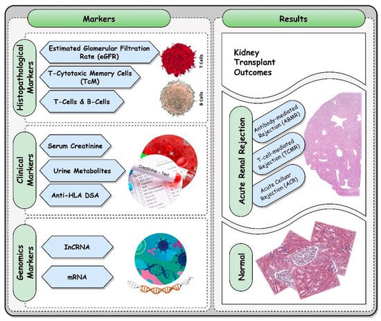 The prohibitive expense of postsurgical maintenance, amounting to thousands of dollars per month for antirejection medications, presents a significant challenge for some patients []. Untreated rejection can lead to major health problems []. To address this issue and enhance transplant outcomes, early detection of renal rejection through innovative biomarkers is essential []. These markers include histological, clinical, and genetic indicators. While biopsy remains the gold standard, from these markers, clinical biomarkers such as KIM-1 and CXCL-10 show potential for early diagnosis and prognosis prediction of renal rejection [].