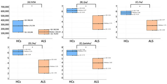 Figure 1. Comparison of voice parameters between healthy controls and ALS patients. This figure illustrates the differences in various voice parameters between healthy controls (HCs) and patients with amyotrophic lateral sclerosis (ALS). Box plot of tVSA (A); articulation rate of the syllable /pa/ (B); /ta/ (C); /ka/ (D); and the sequence /pataka/ (E). Each plot illustrates the median, first quartile (Q1), and third quartile (Q3) values, comparing the distributions between HCs and ALS patients. The symbol * denotes a significant difference at p < 0.05.