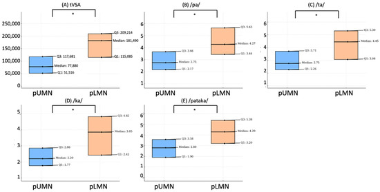 Figure 2. Comparison of voice parameters between prevalent UMN and LMN ALS patients. This figure shows the differences in voice parameters between ALS patients with prevalent upper motor neuron (pUMN) and prevalent lower motor neuron (pLMN). Box plot of tVSA (A); articulation rate of the syllable /pa/ (B); /ta/ (C); /ka/ (D); and the sequence /pataka/ (E). Each plot illustrates the median, first quartile (Q1), and third quartile (Q3) values, comparing the distributions between these two ALS phenotypes. The symbol * denotes a significant difference at p < 0.05.