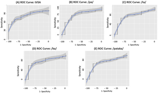 Figure 3. Discrimination of ALS patients with prevalent UMN and LMN impairment using voice parameters. The figure shows the ROC curves for various voice parameters able to discriminate ALS patients with prevalent upper motor neuron (pUMN) impairment and those with prevalent lower motor neuron (pLMN) impairment. ROC curve of tVSA (A); articulation rate of the syllable /pa/ (B); /ta/ (C); /ka/ (D); and the sequence /pataka/ (E). The area under each curve quantifies the accuracy of the respective voice parameter as a diagnostic tool for distinguishing these two ALS phenotypes.
