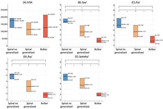 Figure 4. Comparison of voice parameters according to the site of onset in ALS patients. This figure illustrates the differences in various voice parameters among ALS patients, grouped according to their site of disease onset. Box plot of tVSA (A); articulation rate of the syllable /pa/ (B); /ta/ (C); /ka/ (D); and the sequence /pataka/ (E). Each plot illustrates the median, first quartile (Q1), and third quartile (Q3) values, comparing the distributions between patients with spinal onset (both with and without evidence of bulbar symptoms at clinical evaluation) and those with bulbar onset. The symbol * denotes a significant difference at p < 0.05.