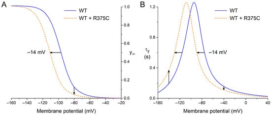 In their recent study of the R375C mutation in HCN4, Alonso-Fernández-Gatta et al. [69] carried out whole cell patch clamp experiments at room temperature on Chinese hamster ovary (CHO) cells expressing WT, homomeric R375C mutant, or heteromeric R375C mutant (WT + R375C) HCN4 channels. Estimated from the graphical representation of their patch clamp data, the fully activated WT + R375C HCN4 current density at −140 mV was ≈50% of the current density of the WT current, whereas the steady-state activation curve was shifted by ≈−14 mV, as illustrated in Figure 2A, with no change in the reversal potential of the HCN4 current. The mutation-induced ≈50% decrease in fully activated HCN4 current was incorporated into the model as a 50% decrease in fully activated conductance of If (gf), whereas the shift in the steady-state activation curve was incorporated as a −14 mV shift in the voltage dependence of the If activation gate, thus also applying this hyperpolarizing shift to the bell-shaped (de)activation time constant curve, as illustrated in Figure 2B. This latter shift results in an increase in the time constant of activation at highly negative membrane potentials, which would explain the experimentally observed mutation-induced slowing of the HCN4 current activation at −130 mV.