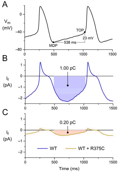 Charge carried by If during diastolic depolarization. (A) Prerecorded AP waveform of an isolated human sinus node pacemaker cell. During the diastolic depolarization from the maximum diastolic potential (MDP) to the take-off potential (TOP), which takes 538 ms, the membrane potential (Vm) depolarizes by 23 mV. (B) Associated reconstructed WT If, which carries a charge of 1.00 pC (filled area) as an inward current during diastolic depolarization. (C) Associated reconstructed WT + R375C If, which carries a charge of 0.20 pC during diastolic depolarization. The AP waveform of panel A is a typical waveform obtained from a set of single isolated human SAN pacemaker cells [61], and the If curve of panel B is reconstructed from this typical AP waveform and the If equations of the Fabbri–Severi model [62], which are based on the If data obtained in voltage clamp experiments on the same set of single-isolated human SAN pacemaker cells [61,63].