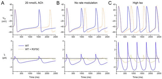 Electrical activity of the Fabbri–Severi model of a human SAN pacemaker cell with its default ‘wild-type’ If (WT; solid blue lines) and heteromeric R375C mutant If (WT + R375C; orange dotted lines) at different levels of autonomic tone. (A) Vagal tone (simulated ACh concentration of 20 nmol/L). (B) No rate modulation (default model). (C) β-Adrenergic tone (‘High Iso’ settings of the model).