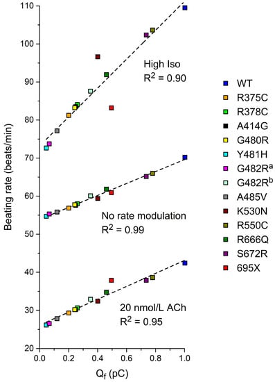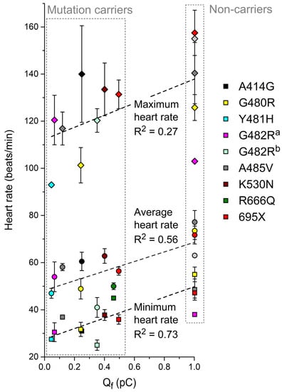 Minimum, average, and maximum heart rates obtained during 24 h Holter recordings from heterozygous carriers of the mutations in HCN4 as indicated or from non-carriers of the same family (Table 1) as a function of Qf (Section 3.3). a If parameters are based on Milano et al. [71]. b If parameters are based on Schweizer et al. [74]. Dashed lines are linear fits.