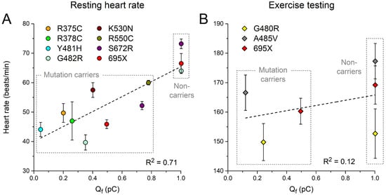 (A) Resting heart rates and (B) maximum heart rates during exercise testing from heterozygous carriers of the mutations in HCN4 as indicated or from non-carriers of the same family (Table 2) as a function of Qf (Section 3.3). Dashed lines are linear fits.