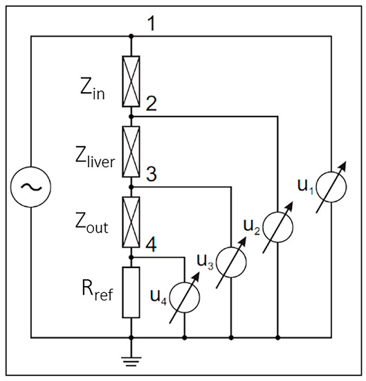 BIS measurements were carried out using a self-developed four-electrode measurement and data collection procedure published by Vizvari et al. [38]. The main principle of the self-developed BIS measuring instrument is illustrated in Figure 1. The purpose of the measurement is to define the Zliver impedance values at multiple frequency points. Zin and Zout represent the contact impedance corresponding to an adhesive body surface electrode and the body. Although, the contact impedances do not appear in the Zliver impedance value. The Zin and Zout values suppress the Zliver impedance due to the behavior of the model at low frequencies. Therefore, it does not appear in the resulting impedance (Z) of the model. The effectiveness of the method is based on the use of a reference resistance (Reef) against the unknown impedance (Zliver) and compared. A voltage generator is used to excite the measured object, then the voltage values u1, u2, u3 and u4 are measured in nodes 1, 2, 3 and 4. During the data collection procedure, the grounding point (0 V) of the system is connected directly to the tested material and the measured potential values are compared to this point. The potentials measured in nodes 1, 2, 3 and 4 are subtracted from each other to eliminate errors in the measured data.