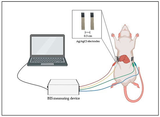 The BIS measurements were performed using intraperitoneal anesthesia with a mixture of ketamine and xylazine (ketamine 100 mg/kg and xylazine 10 mg/kg). The dose of the mixture was 0.15 mL/100 g body weight. Fur was removed from the abdominal regions. Ag/AgCl self-adhesive skin surface short electrode pads (Bodystat Ltd., Isle of Man, UK) were used, same as is applied in human BIS measurement; however, the surface area of the electrode was reduced to a quarter. The electrodes were applied to the level of the lower rib arches on both sides of the body, according to the human BIS protocol. The outer electrodes were placed on both sides of the body, and the inner electrodes were placed approximately 0.5 cm away from them (Figure 2).