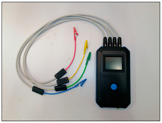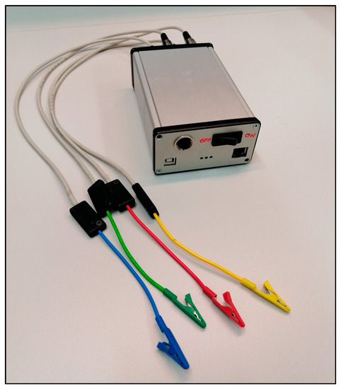 Figure 2 shows the assembled measuring system. This methodology was previously validated [38]. The silver box represents the self-developed BIS measuring instrument equipped with different colored cables (red, yellow, green, blue). The generator is connected with red and blue wires, while the measuring channels are connected with yellow, green and blue wires. The cables end with crocodile clips, which are connected to the self-adhesive body surface electrodes. The BIS measuring device is connected to a computer, where the measurement results are displayed during the procedure. The data collection process can start when the cables have been connected to the electrodes in the appropriate order.