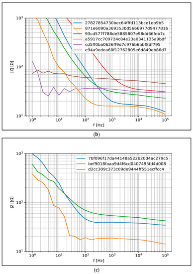 The measured Z spectra are displayed in a lin–log diagram, where the x-axis represents the frequency in Hz and the y-axis is the magnitude in ohms.