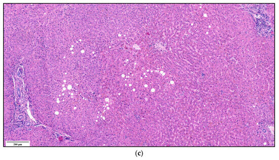 Representative rat liver specimens from the three groups of steatosis are shown in Figure 8. Figure 8a shows the histological analysis of a rat liver without steatosis, inflammation or fibrosis. It shows normal hepatocytes arranged in cords and obvious sinusoids, indicating that there are no pathological lesions. In Figure 8b, mild microvesicular steatosis (i.e., the accumulation of small fat droplets) can be seen in the cytosol of the hepatocyte. Figure 8c shows moderate steatosis.