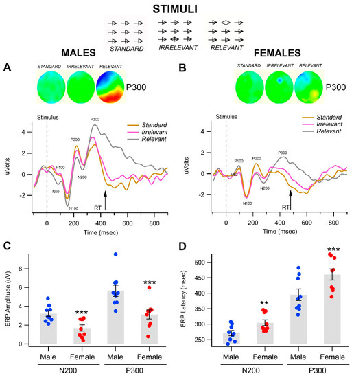 - Steffensen, S.C.; Ohran, A.J.; Shipp, D.N.; Hales, K.; Stobbs, S.H.; Fleming, D.E. Gender-selective effects of the P300 and N400 components of the visual evoked potential. Vis. Res. 2008, 48, 917–925. [Google Scholar] [CrossRef] [PubMed]
