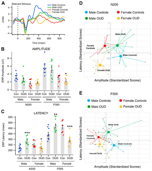 Our central aim was to use electrophysiological (EEG) scalp recordings to investigate gender-linked behavioral, physiological, or molecular markers in men and women with and without addiction and opiate use disorder (OUD). Our primary hypothesis was that there would be significant gender-by-OUD interactions in ERPs. Specifically, we wanted to observe N200 and P300 event-related potentials (ERPs) and brain function of those women and men struggling with OUD when compared to healthy non-OUD control participants by use of visual stimuli in a controlled setting. We also hypothesized that a basic neurophysiological marker might provide an objective index for the efficacy of treatment strategies for addiction—in particular opiate addiction and OUD. While N200 and P300 amplitudes were not significantly affected by OUD for either men or women in this study, latencies were significantly affected, and differentially, in men vs. women with OUD. Male OUD participants exhibited longer and female OUD participants exhibited shorter latencies, for both N200 and P300, than for non-OUD controls. These findings suggest that one can effectively use an EEG to objectively measure differences in ERPs over time and monitor improvement via simple individual EEG data studies. These techniques could be applied throughout initial treatment and beyond, and potentially help identify changes in biological patterns that could indicate risk of overlap in OUD, as we continue to face the question of why OUD overdose deaths happen in men at twice the rate as for women. Significant differences in patterns observed in males and females with opiate addiction suggests that the groups are distinct from one another. These findings are also in line with previous studies demonstrating reduced P300 amplitudes in males with alcohol and cocaine addiction, as compared with healthy male controls [33,34,35,52,79,114,116,117]. Until recently, little has been researched or said about females and addictions and SUDs [29], especially regarding P300. In addition, there are few ERP studies of visual cognitive processing involving P300s differences between men and women. The current study of object recognition stimuli in a Go/NoGo task was designed to address that gap, following two previous EEG studies that found P300s and N200s do not significantly vary across the menstrual phases, suggesting that the menses cycle does not account for possible cognitive processing differences between men and women [118,119].