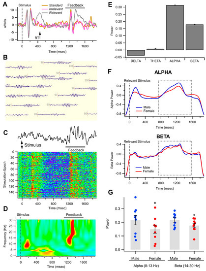 Gender differences in alpha and beta oscillations in a visual object recognition task. (A) This is a representative 2 s trace of raw electroencephalogram (EEG) data obtained in one non-OUD male participant at Pz for a Relevant stimulus. Note the feedback oscillations that occurred at around 1200 ms after the stimulus, when the feedback message was delivered to the subject. (B) Raw EEG data from a Relevant stimulus epoch in the same subject in (A) for all electrodes on the head. Top is front and bottom is back of the head. Note the oscillations that appeared during the feedback stimulus all around the head, but most evident at the back of the head. (C) Raw EEG epoch from one back of the head electrodes in (B) showing the robust oscillations during the feedback message as a Raster color plot of individual traces obtained for each of the 154 stimuli presented in one session for this representative participant. Red represents high positive amplitudes and violet represents low. Note that the oscillations are present for most of the epochs. (D) Wavelet analysis of a Relevant stimulus epoch from the same electrode shown in (C). Red indicates positive power while violet indicates negative. Note that in this subject there is robust theta, alpha, and beta power during the feedback stimulus. (E) This graph shows wavelet analysis of the average power for 4 bands during the feedback Relevant stimulus in this subject. Note that the feedback oscillation is dominated by alpha and beta activity. (F) Superimposed grand-averaged wavelets of alpha (8–13 Hz; above) and beta (13–30 Hz; below) activity in males vs. females for the Relevant stimuli. Note that alpha and beta activity is high around 1200 ms after the stimulus, which reflects the raw waveforms and wavelet analysis in (B–D). The dashed-line box indicates the window during the feedback stimulus which was used for determination of alpha and beta power. (G) This graph shows alpha and beta power (trapezoidal integration of area in dashed boxes shown in (C,D) over the epoch) for all men compared to all women for the Relevant stimulus condition across back of the head electrodes. Note that both alpha and beta power are significantly higher in men overall than for women Note * p < 0.05.