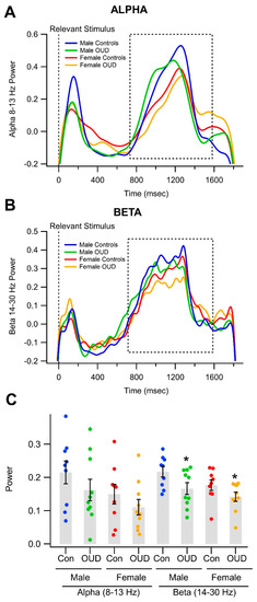 Effects of opioid use disorder (OUD) on alpha and beta oscillations in a visual object recognition task. (A) Superimposed grand-averaged alpha and beta (B) power determined with wavelet analysis comparing men vs. women and OUD vs. non-OUD participants. There appears to be a tendency for men’s waveforms to be greater than those for women during the feedback stimulus shown during the dashed-lined box corresponding to the feedback stimulus. (C) This graph shows alpha and beta power measurements for all men compared to all women and OUD vs. non-OUD. Although the trend was for OUD male and female subjects to have lower have lower alpha power, it was not significant. However, beta power was significantly lower in men and women participants with OUD vs. non-OUD controls. Note * p < 0.05.