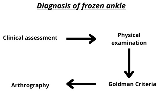Frozen ankle, which is mainly diagnosed by clinical assessment, most frequently appears as deep pain in the posterior ankle. Prior to considering arthroscopic treatment, it is important to clinically evaluate the presence of extra-articular ankle stiffness resulting from the adhesion of periarticular muscles or tendons. Additionally, if there is limited passive dorsiflexion of the toes when the ankle is in dorsiflexion, it can be indicative of tight long toe flexors. Similarly, limited passive plantar flexion of the toes when the ankle is in plantar flexion may suggest tightness in the long toe extensors [