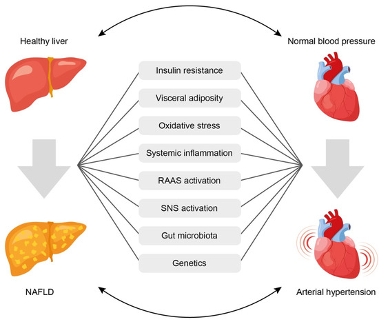 Despite the presence of bidirectional relationship between NAFLD and AH, it is often difficult to establish which of the two conditions occurs first. However, the existence of common mechanisms determines the high risk of developing one of them in cases where the other is already present. The mechanisms of the relationship between NAFLD and AH are mostly known (Figure 1) [70], but they continue to be explored in more depth. Common links in pathogenesis that may explain the potential pathophysiological relationship between NAFLD and AH include: