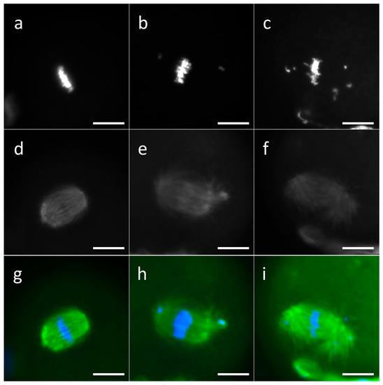 Representative images of MII plate in MII oocytes. Chromosomes were classified as normal (a), slightly aberrant (b), or aberrant (c). Spindle was classified as normal (d), slightly aberrant (e), or aberrant (f). Merged images of DNA and spindle staining are presented (g–i). MII oocytes were labeled by mouse anti α-tubulin primary antibody and secondary antibody conjugated with DyLight® 594, and chromatin staining was performed by Hoechst 33342. Scale bars: 10 μm.