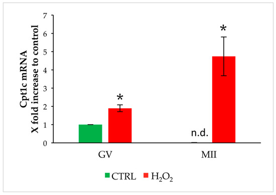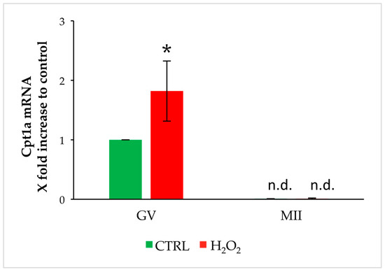 Changes in gene expression of Cpt1a in GV and MII oocytes stressed by H2O2. Values are means ± SEM of three determinations. The fold change of each gene is shown as 2−ΔΔCt. Statistical comparison was performed by t-test. * p < 0.05 vs. control; n.d.: not detectable.