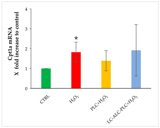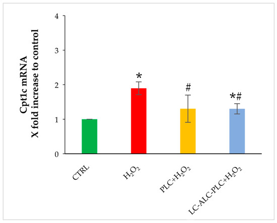 As observed for Ctp1a, the exposure to H2O2 induced the transcript expression of Cpt1c. Preincubation with PLC prevented the Cpt1c increase induced by the oxidative insult and restored its expression to levels similar to control. Incubation with the mixture of LC–ALC–PLC prior to OS exposure lowered the expression of Cpt1c in comparison to the H2O2 group. In comparison to control, the mixture was not able to restore Cpt1c expression to the basal level (Figure 5).