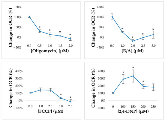 We tested oligomycin in concentrations ranging from 0.5 to 2 μM. The establishment of the most suitable uncoupler was based on the comparison between the effects of FCCP, as per the Seahorse XF Cell Mito Stress Test Kit instructions, and 2,4-DNP, using concentrations ranging from 1 to 7.5 μM and 100 to 250 μM, respectively, with 2,4-DNP being identified as the most effective. Antimycin A/rotenone were tested at concentrations from 1 to 3 μM.