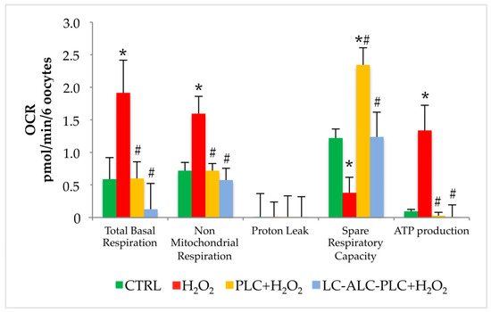 Comparison of bioenergetics profile of GV oocytes exposed to plain medium (CTRL), H2O2, or incubated with PLC or LC–ALC–PLC prior to H2O2 analyzed by extracellular flux analysis. Data show mean ± SEM. Statistical comparison was performed by t-test. * p < 0.05 vs. CTRL; # p < 0.5 vs. H2O2.