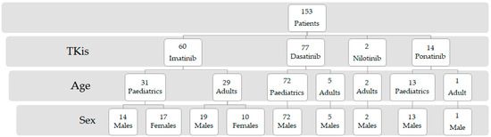 We enrolled 153 patients diagnosed with CML. The one-way ANOVA test, calculated considering the different groups of samples (imatinib, dasatinib, nilotinib, and ponatinib), reported a p-value <0.001. The flow chart of the patient’s distribution is shown in Figure 1.